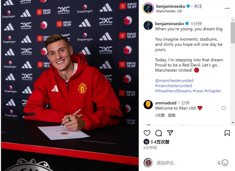 塞斯科配文:“当你年青时,你会怀揣广泛梦念念。你会念念象那些本领、球场和球衣,期盼有一天它们属于你。如今,我正已矣这个梦念念。很自爱成为红魔的一员。加油,曼联!”