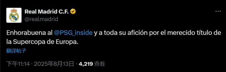 皇马官方写谈:“道贺巴黎圣日尔曼以偏激整个的球迷,恭喜你们获得实至名归的欧洲超等杯冠军。”