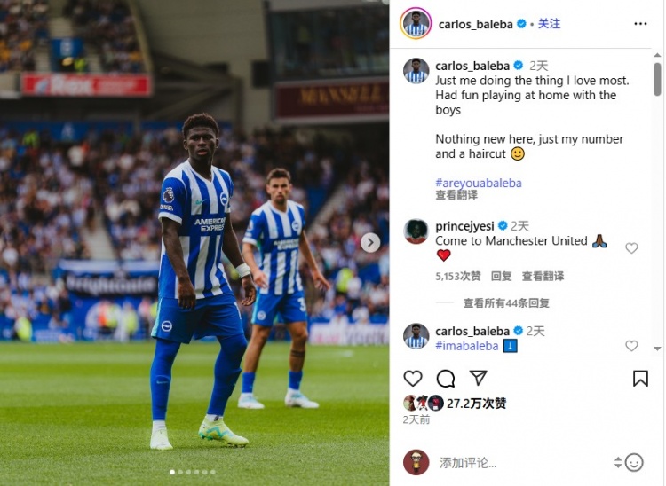 8月19日讯 布莱顿中场巴莱巴日前在Instagram晒出赛场照,驳斥区好多球迷邀请他加盟曼联。