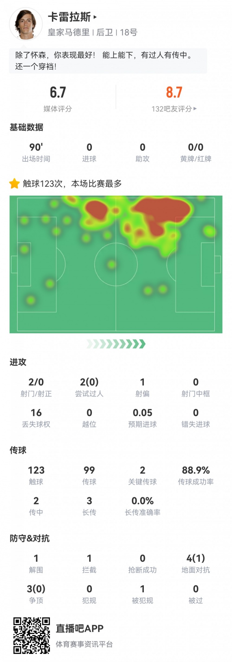8月20日讯 西甲首轮,皇马1-0奥萨苏纳。此役卡雷拉斯西甲首秀首发打满全场,球员全场要点数据如下↓
