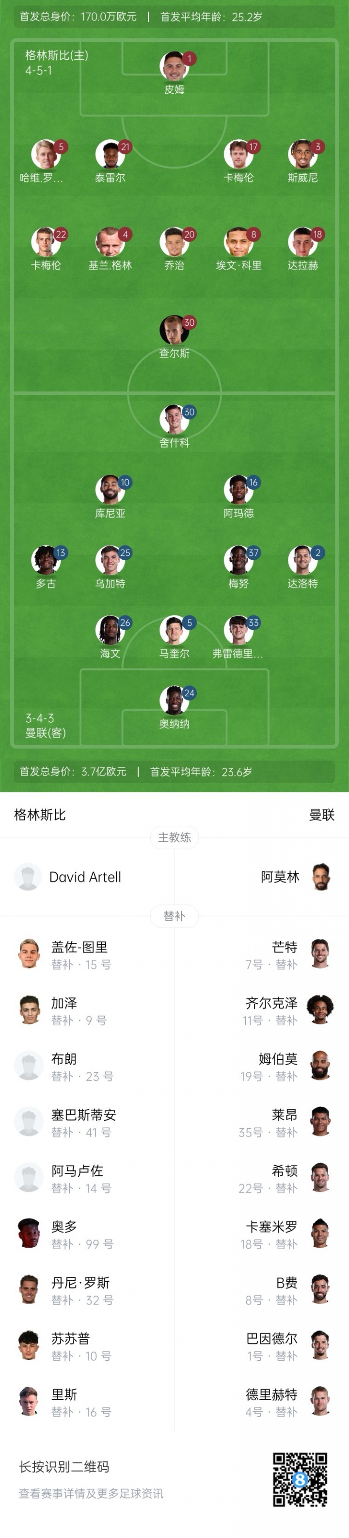 曼联首发11东说念主身价达3.7亿欧,敌手格林斯比11东说念主总价170万欧。