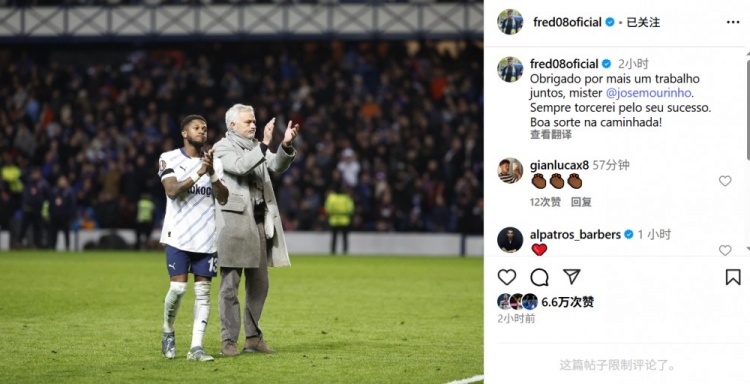 弗雷德晒出我方和穆帅在赛场的同框照,配文写说念:“感谢您再次与我并肩战争,穆里尼奥先生。我会永恒为您加油,祝您再次赢得得胜,也祝您改日好运。”