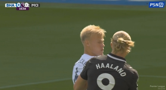08月31日讯 曼城vs布莱顿第9分钟,哈兰德单刀力量太小被充公!跟防的范赫克推搡哈兰德,随后哈兰德抗拒不睦!