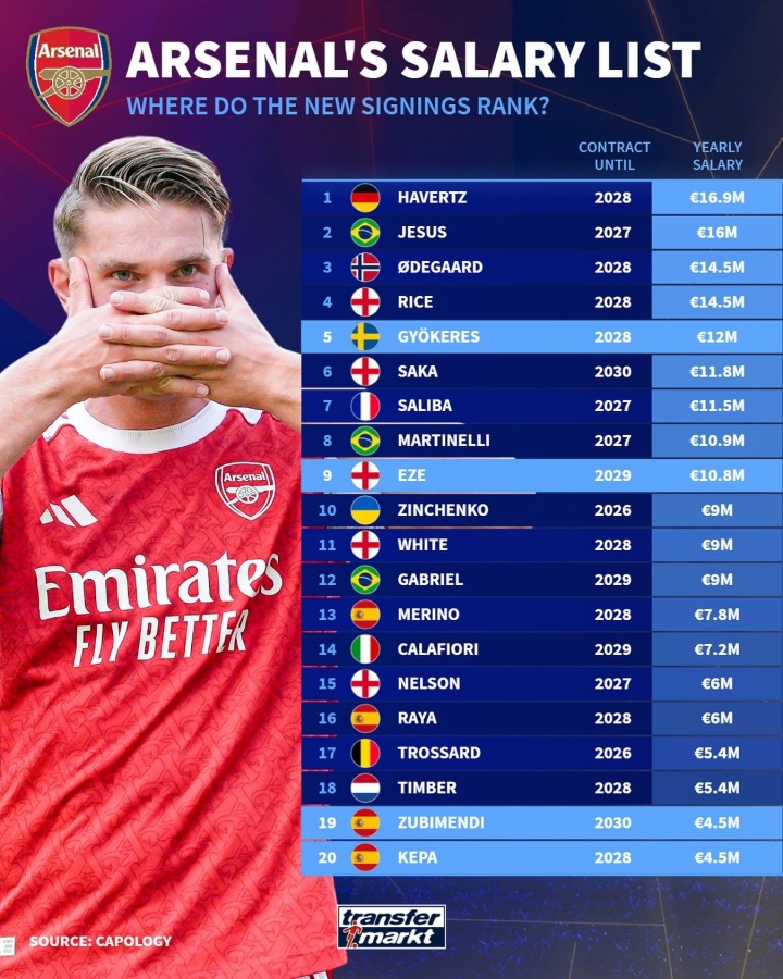09月01日讯 德转列出了阿森纳球员的年薪名次,哈弗茨以1690万欧居首,今夏引进的约克雷斯和埃泽参预了球队前十。