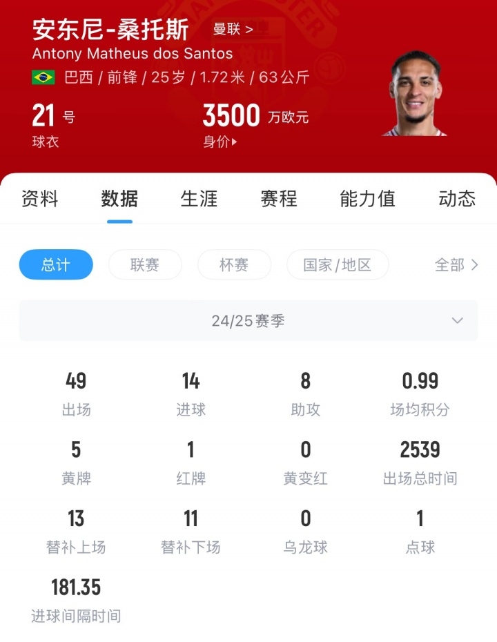 25岁的安东尼2022年8月加盟曼联,总价9500万欧。遵循曼联于今,球员出战96场得益12球5助。