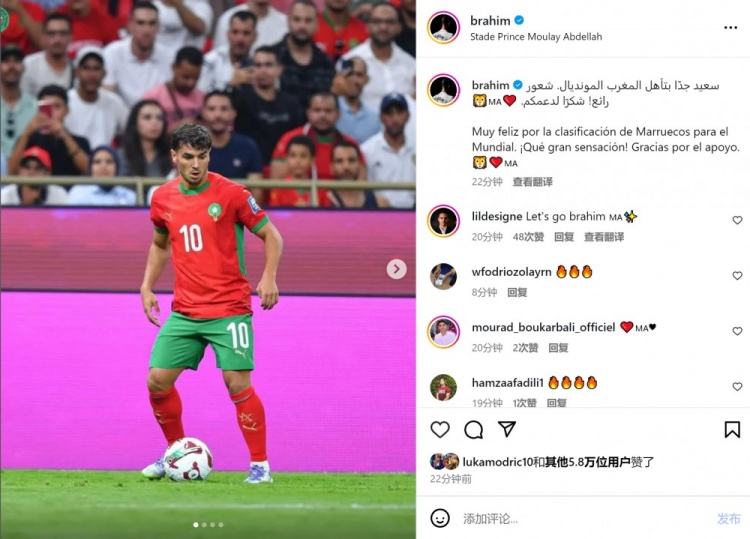 迪亚斯此役为摩洛哥首发出战,他在外交媒体上晒出比赛相片,配文:“为摩洛哥晋级寰宇杯感到无比忻悦,何等隐私的嗅觉!感谢全球的营救。”