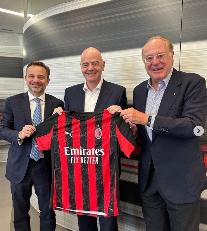 9月11日讯 不久前,外洋足联主席因凡蒂诺拜谒米兰总部,并与米兰高层合影。