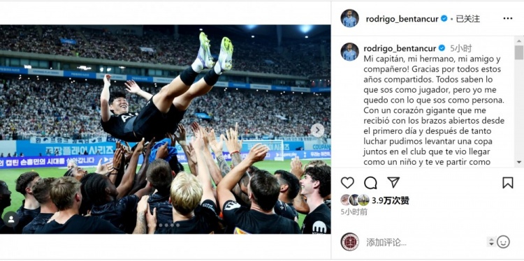 感谢你所作念的一切,昆玉,咱们在俱乐部会特出思念你!祝你和你的家东谈主在新征途中一切获胜!但愿很快能再次相遇,外传!我特出爱你!”