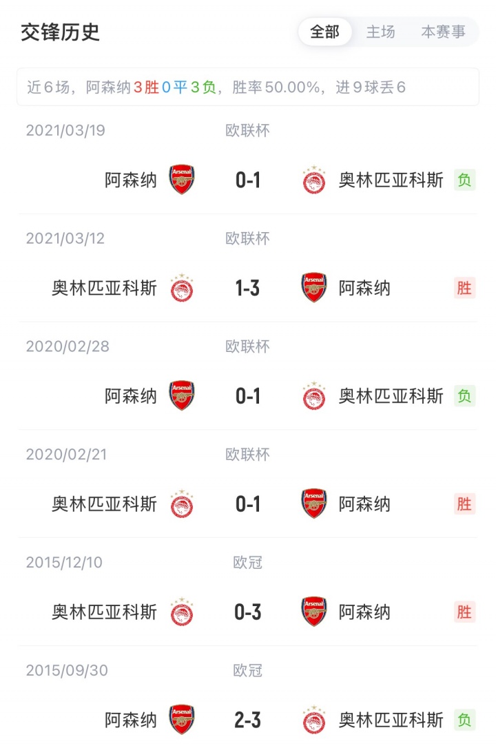 阿森纳首轮2-0客胜毕尔巴鄂,奥林匹亚科斯0-0战平帕福斯。阿森纳与奥林匹亚科斯此前在欧战共交手12次,打成6胜6负。两队上一次交手是2020/21赛季欧联杯1/8决赛,阿森纳两回合3-1、0-1淘汰敌手。