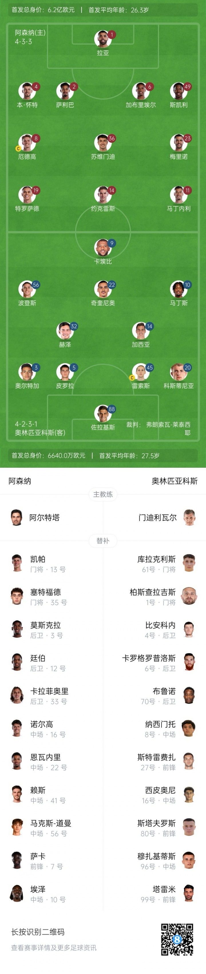阿森纳首发:1-拉亚、2-萨利巴、4-本-怀特、6-加布里埃尔、49-斯凯利、8-厄德高、36-苏维门迪、23-梅里诺、11-马丁内利、19-特罗萨德、14-约克雷斯