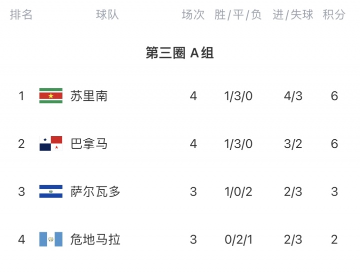 10月15日讯 中北好意思及加勒比海世初赛A组第4轮比赛战罢,苏里南与巴拿马抓手言和,两队仍位居小组前两名。