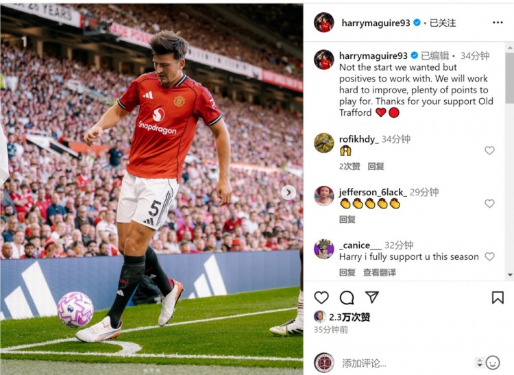 马奎尔社媒晒出比赛像片,并写谈:“这不是咱们念念要的开局,但也有积极的成分不错接纳,咱们会致力于阅兵,还有无数的积分不错争取。感谢宇宙在老特拉福德的复古。”