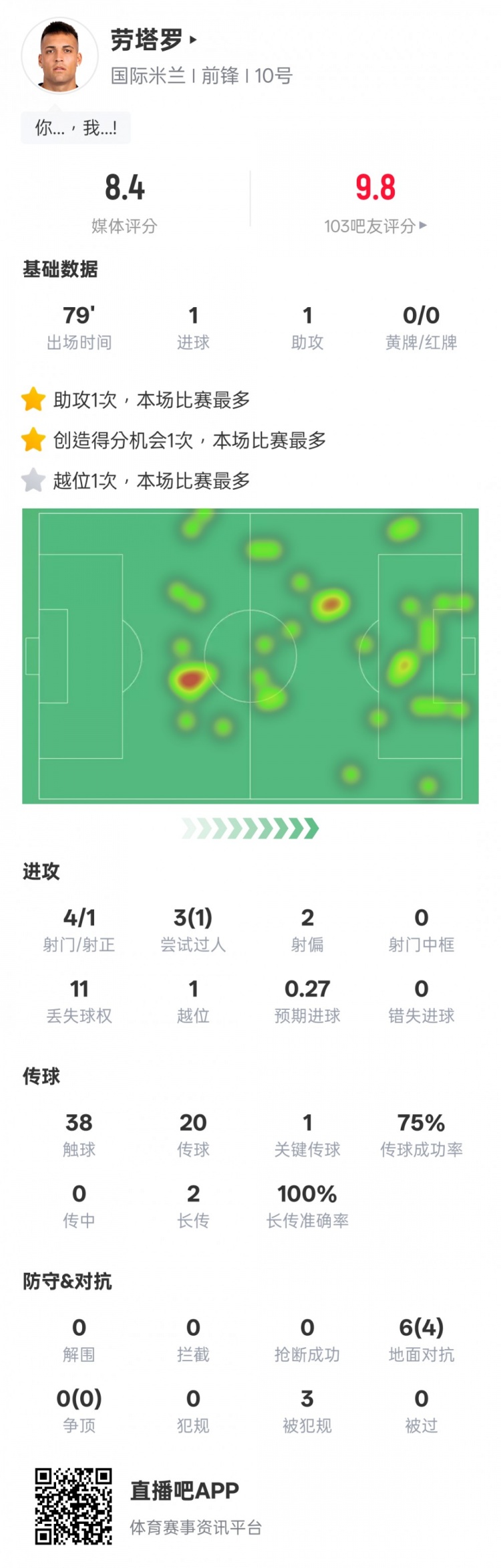 8月26日讯 2025-26赛季意甲首轮,国米5-0大捷齐灵,劳塔罗首发出战,传射立功,另外还送出1次关键传球,评分8.4。