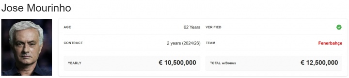 客岁6月上任时,费内巴切官方曾显现穆里尼奥合手教薪水。穆帅那时与费内巴切签约两年,基础年薪1050万欧,奖金200万欧,年薪最高可达1250万欧。提前下课意味着穆帅只拿到了合手教第一年的薪水。