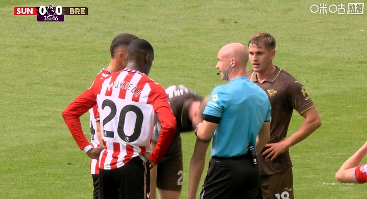 比赛第36分钟,桑德兰队长扎卡与布伦特福德中场亚尔莫柳克之间发生了一些争抓,主裁判安东尼-泰勒介入和洽了这次争端。现在两边0-0平。