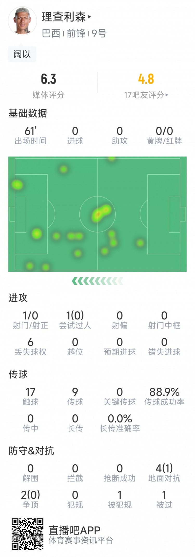 9月10日讯 在本轮南好意思区世初赛巴西对阵玻利维亚的比赛中,理查利森首发登场,以下为他在本场数据: