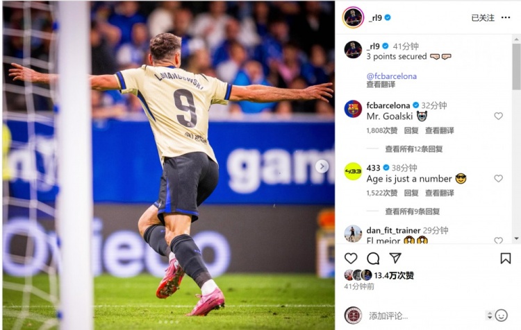 莱万社媒晒出我方庆祝进球的相片,配文:三分平直🤜🏻🤛🏻