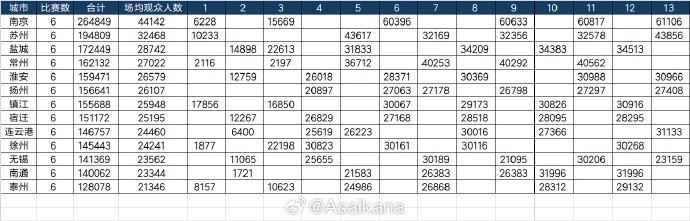 2025江苏省城市足球联赛(“苏超”)成例赛阶段13轮78场比赛一齐死心,所有淘汰赛阶段现场不雅世东说念主数达2118920东说念主次,场均27166东说念主。南京队6个主场比赛总不雅世东说念主数为264849东说念主,是现场不雅世东说念主数最多的主场城市;苏州(194809东说念主)、盐城(172449东说念主)分列二、三位。