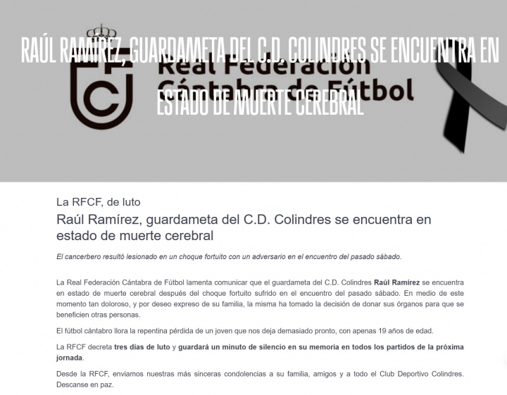 坎塔布里亚皇家足球协会缺憾地晓喻,C.D.科林德雷斯的门将劳尔-拉米雷斯在上周六比赛中遭遇不测碰撞后,被确诊为脑死一火。在这一极为灾祸的时分,把柄其家东说念主的明确意愿,他们决定捐献他的器官,以造福他东说念主。