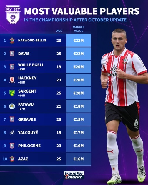 10月6日讯 德转更新英冠球员身价,在现在的英冠球员身价中,南安普顿球员贝利斯和伊镇球员戴维斯2200万欧比肩第一。