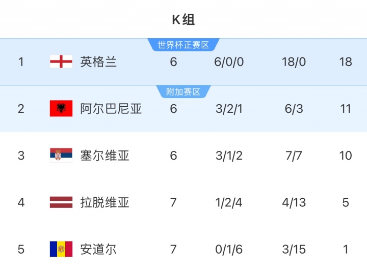 10月15日讯 世初赛欧洲区小组赛K组第8轮,英格兰客场5-0大捷拉脱维亚,世初赛6轮全胜狂轰18球但0失球,锁定小组头名,提前2轮锁定2026宇宙杯!