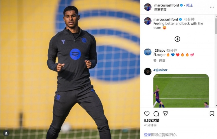在大意媒体上,拉什福德晒出了测验照并写说念:嗅觉很多了,重返了球队测验场。