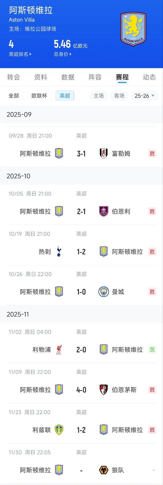 11月24日讯 英超第12轮,阿斯顿维拉2-1打败利兹联,近7轮英超获得6胜1负狂砍18分。