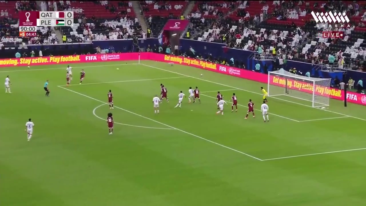 12月02日讯 阿拉伯杯A组比赛,巴勒斯坦第95分钟1-0读秒绝杀卡塔尔,卡塔而后卫布雷克自摆乌龙,巴勒斯坦球员SIU随便庆祝。