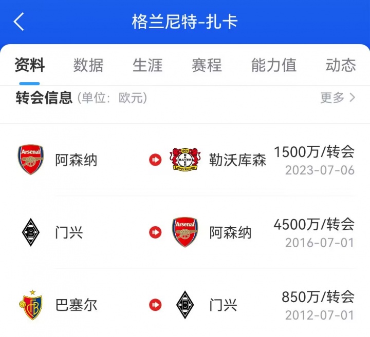 扎卡2023年以1500万欧元从阿森纳转会至勒沃库森,此前曾为阿森纳着力7年,并一度担任阿森纳队长。离开两年后,瑞士中场重返英超。