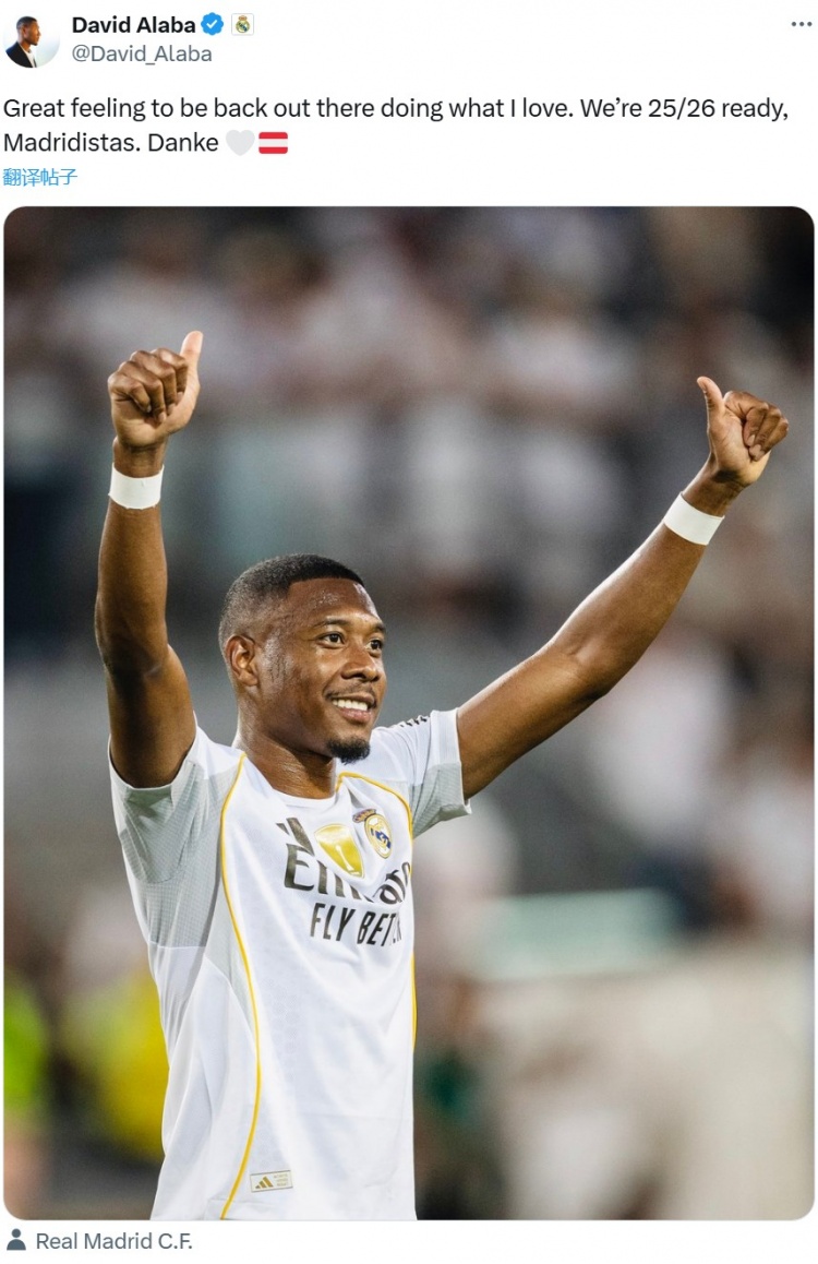 阿拉巴晒出自己照片,并配文写道:“能重返赛场做自己热爱的事情,感觉非常棒。我们已经为25-26赛季做好准备,感谢马德里球迷们。”