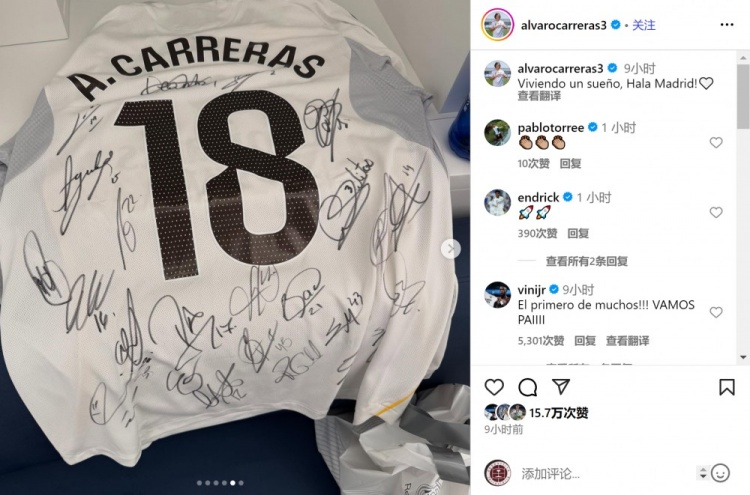 今夏加盟皇马的A费此役踢满全场,帮助球队取胜,他在社交媒体上晒出首秀球衣,上面签满了队友的名字。