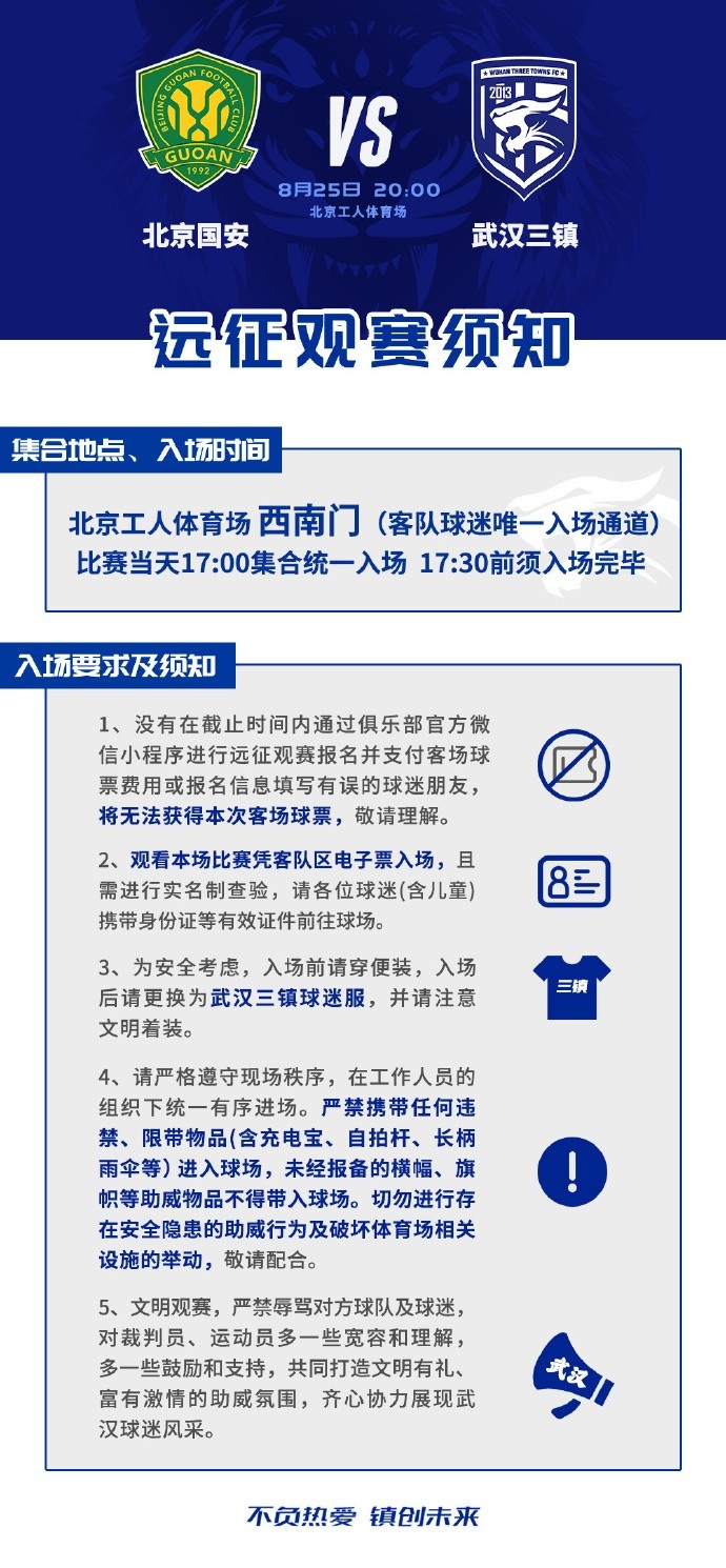 8月25日,武汉三镇将在2025中超联赛第22轮中客场对阵北京国安。即将与各位远征军在看台上相见,期待我们的战斗时刻!