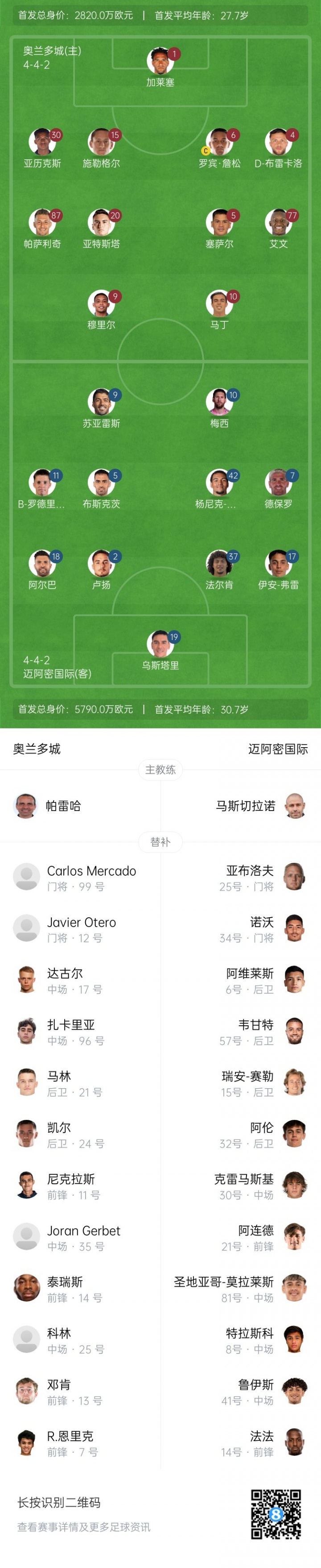 奥兰多城首发:1-加来塞、30-亚历克斯、15-施勒格尔、6-罗宾-詹松、4-D-布雷卡洛、20-亚特斯塔、5-塞萨尔、87-帕萨利奇、77-艾文、9-穆里尔、10-马丁