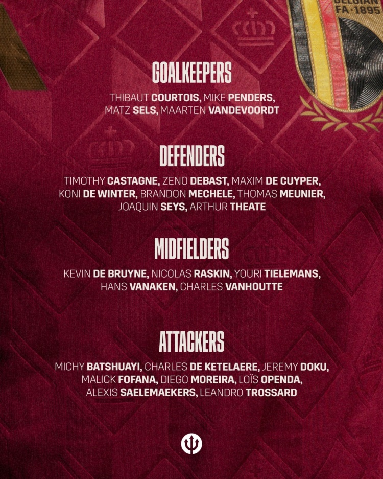 中场:德布劳内(那不勒斯)、拉什金(格拉斯哥流浪者)、蒂莱曼斯(阿斯顿维拉)、瓦纳肯(布鲁日)、范霍特(圣吉罗斯)