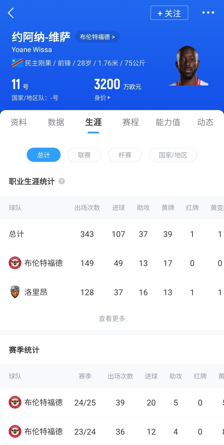 维萨现年28岁,司职前锋,上赛季出场39次,贡献20球5助,目前维萨德转身价为3200万欧元。