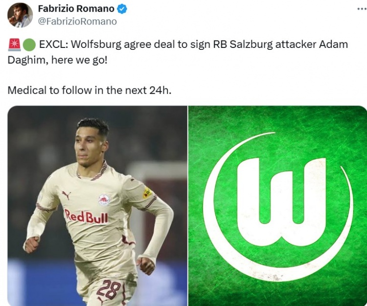 9月1日讯 据知名转会专家罗马诺报道,沃尔夫斯堡即将签下萨尔茨堡红牛攻击手亚当-达吉姆,Here we go!