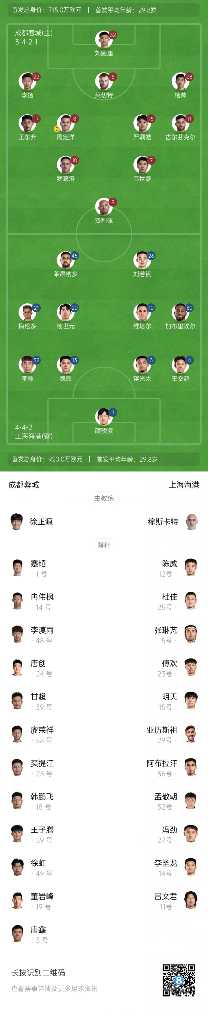 上海海港首发:1-颜骏凌、3-蒋光太、4-王燊超、13-魏震、32-李帅、10-马特乌斯-维塔尔(F)、20-杨世元、21-梅伦多(F)、26-刘若钒、30-加布里埃尔(F)、45-莱昂纳多(F)