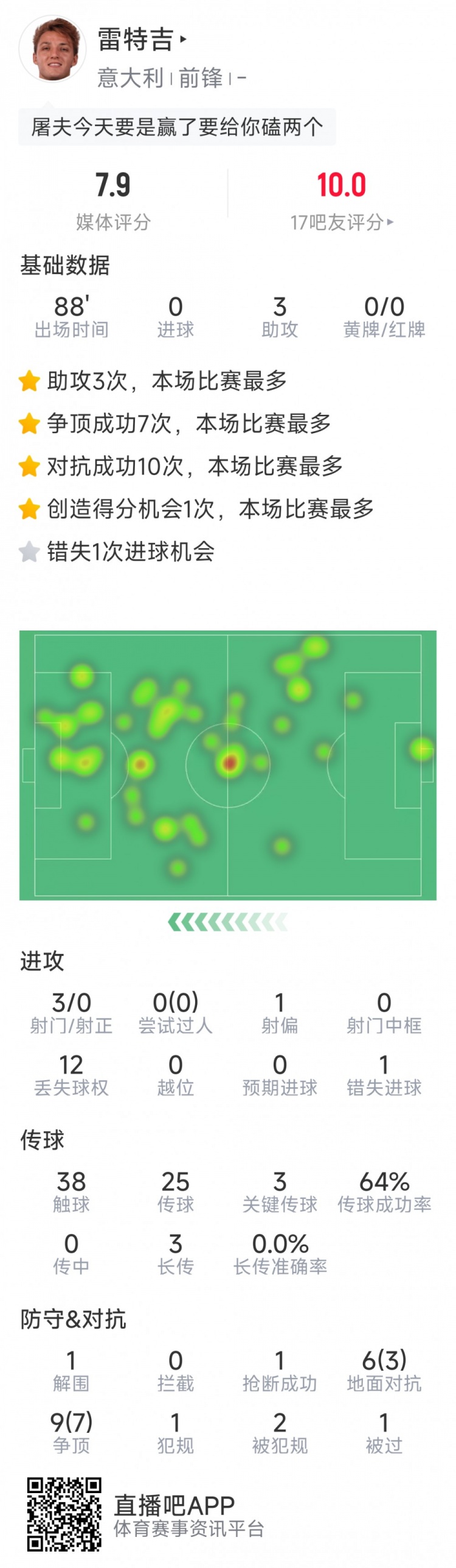 9月9日讯 在本轮世预赛,意大利5-4击败以色列,雷特吉助攻帽子戏法,以下为他在本场数据: