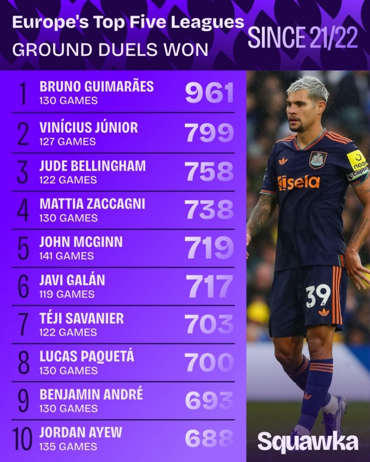 9月11日讯 Squawka统计了2021-2022赛季以来球员在五大联赛地面对抗成功的次数,并列出榜单,吉马良斯961次居首,维尼修斯、贝林厄姆二三位。