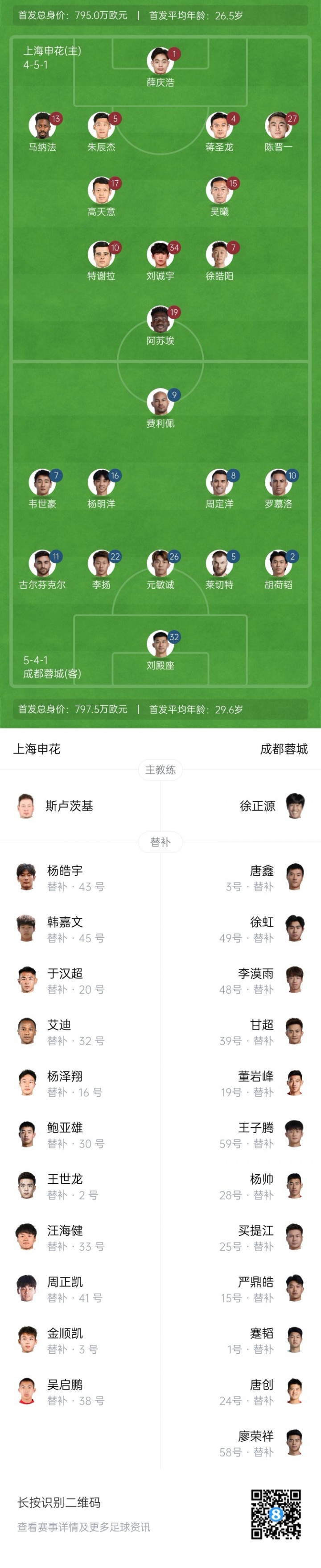 上海申花首发:1-薛庆浩、4-蒋圣龙、5-朱辰杰、13-马纳法(F)、27-陈晋一、7-徐皓阳、15-吴曦、17-高天意、10-特谢拉(F)、19-阿苏埃(F)、34-刘诚宇