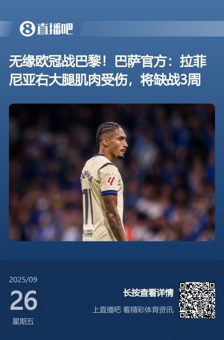 9月26日讯 今日巴萨官宣拉菲尼亚以及霍安-加西亚伤情,拉菲尼亚将伤缺3周,霍安-加西亚将伤缺4-6周。