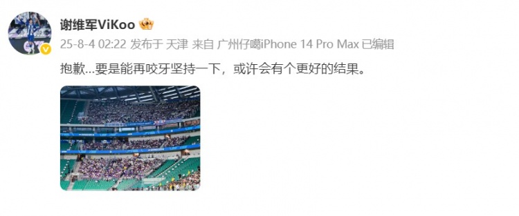 谢维军在个人微博中写道:抱歉…要是能再咬牙坚持一下,或许会有个更好的结果。