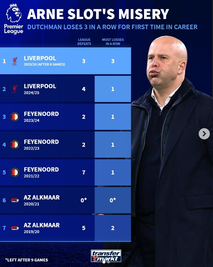 10月20日讯 在本轮英超,利物浦1-2不敌曼联。这也是斯洛特执教生涯首次遭遇联赛三连败,以下为他执教具体情况: