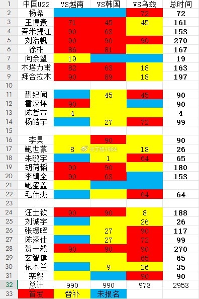 11月18日讯 在本届熊猫杯赛事结束后,记者丁旭统计了中国U22球员在赛事中的出场时间,其中刘浩帆、贺一然两人打满了全部的三轮比赛。