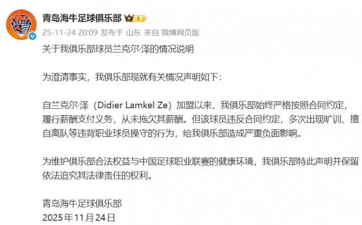 11月24日讯 针对球员兰克尔·泽指控拖欠工资,以及其他一系列风波,青岛海牛发布了官方说明。
