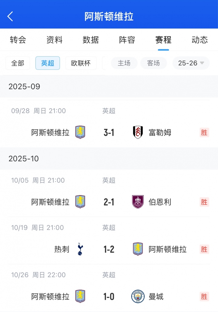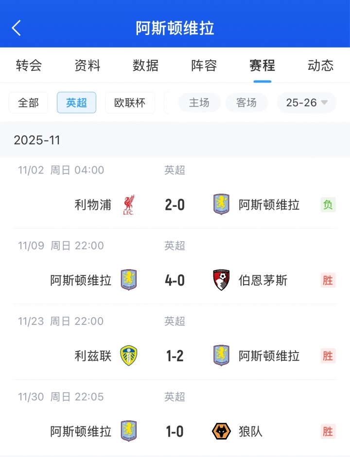 维拉目前排在英超第四位,而在9月份英超开赛后维拉5轮3平2负,仅拿3分排在英超倒数第三。