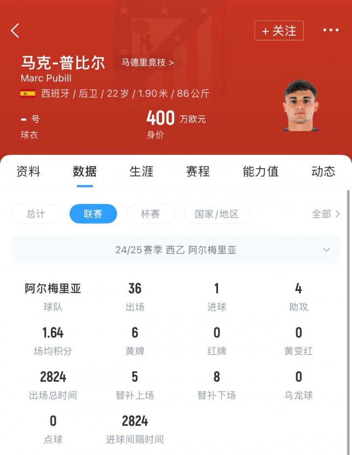 马克-普比尔现年22岁,身高1.9米,司职右后卫,德回身价400万欧。上赛季他在西乙为阿尔梅里亚出场36次,孝敬1球4助攻。