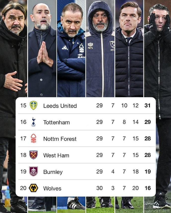 保级区方面,排名第16的热刺29分,只领跑 第17的森林1分。目前在降级区的三支球队:西汉姆28分(与森林同分),伯恩利19分,狼队16分。