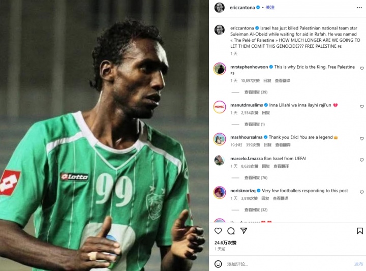 坎通纳在社媒写说念:“以色列刚刚在紧迫拉法时,杀害了巴勒斯坦的球星苏莱曼-奥贝德,他被称为巴勒斯坦的贝利。这么的种族骤一火还要抓续多久?自若巴勒斯坦!”