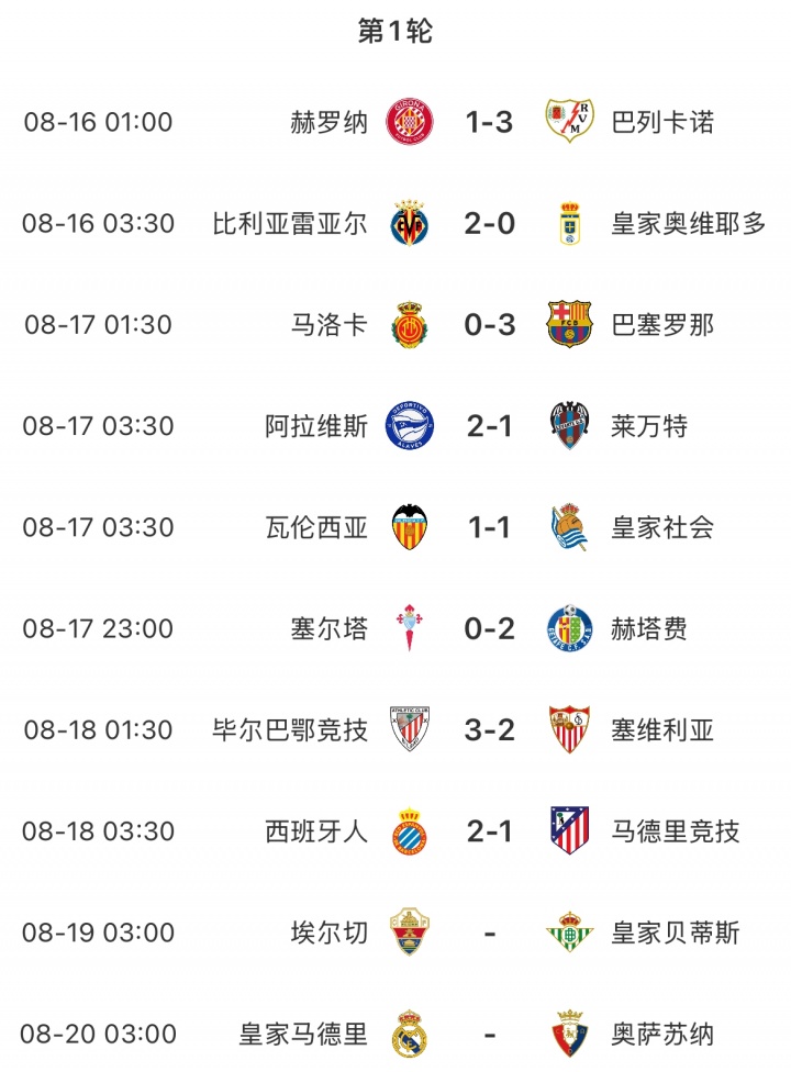 西甲首轮还剩两场未踢,皇马将于20号主场迎战奥萨苏纳,另外一场贝蒂斯19号客战埃尔切。